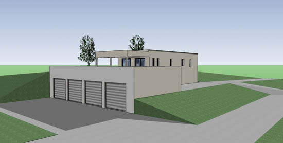 Créer une maison individuelle contemporaine de type P4 avec des grandes terrasses, avancées de toiture et toiture végétalisée; un hangar de 200 m² pour stockage des engins de chantier.